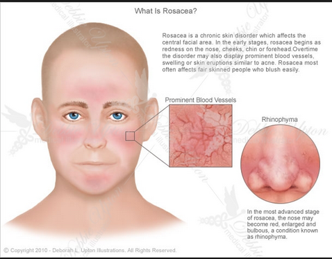 | What do former presidents Bill Clinton and Boris Yeltsin have in common? A condition called acne rosacea, a chronic inflammation of the blood vessels in the skin, which causes a ruddy complexion and small acne-like eruptions on the cheeks, forehead and nose. In men it can often cause the skin on the nose to thicken and swell, leading toa condition called rhinophyma. Nobody know what causes it but the list of potential triggers is endless. The main culprits are alcohol and rich, spicy foods. Because its roots are unknown, there's no permanent cure either, so management is the key. This is partly achieved by identifying what makes the rosacea worse through a process of exclusion and by the use of topical antibiotics - usually metronidazole. A GP's diagnosis is vital since the symptoms can be similar to more serious conditions such as lupus. Rosacea can last a lifetime, especially in men, but often clears up on its own. |